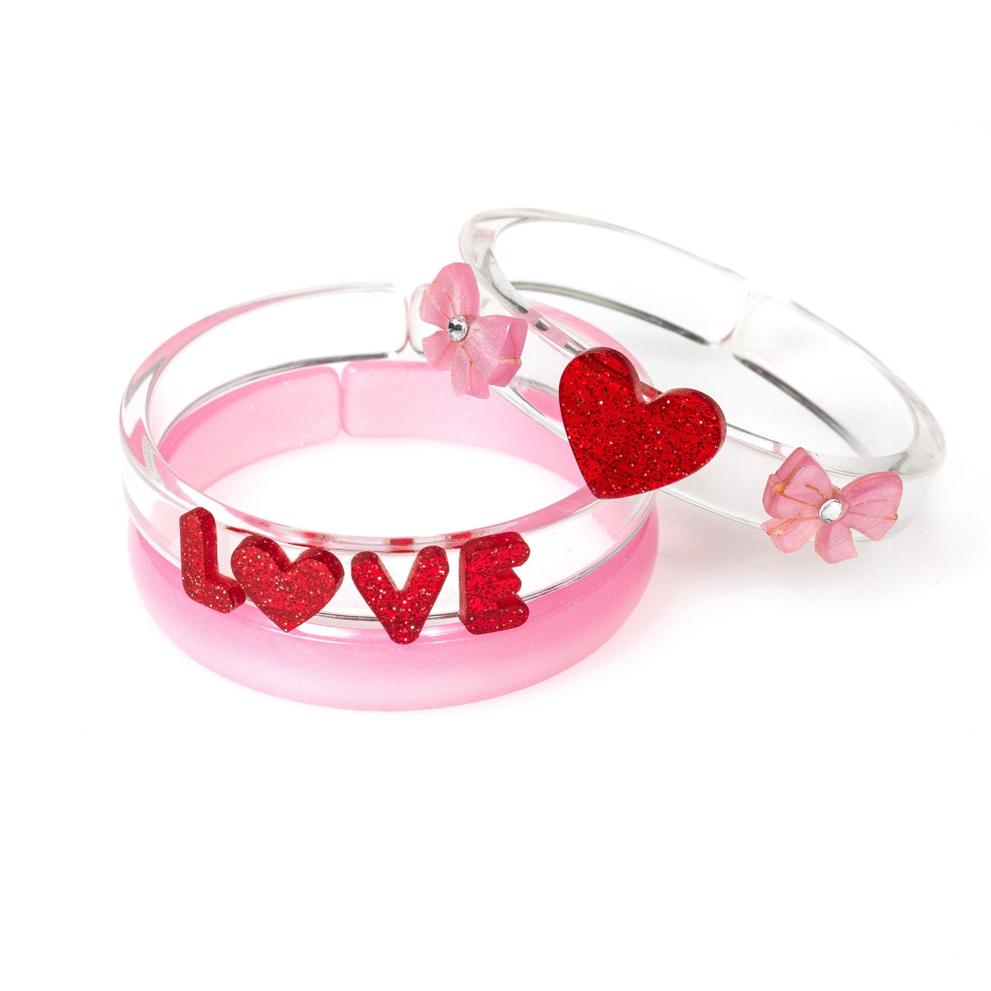 Add a splash of fun to your child's accessory collection with this adorable bangle set! Featuring a pretty pink bangle, one with 'LOVE' and one with hearts and bows!