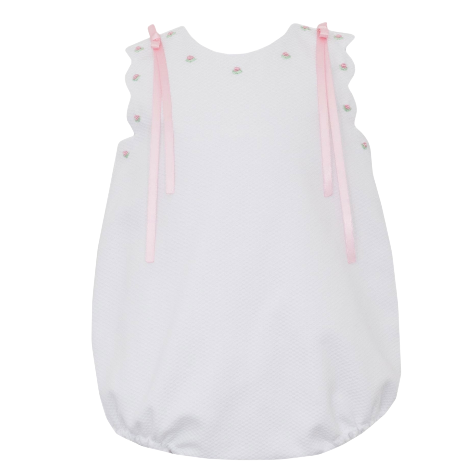 Anavini Bianca white pique sleeveless girl's bubble with scalloped border and pink ribbons