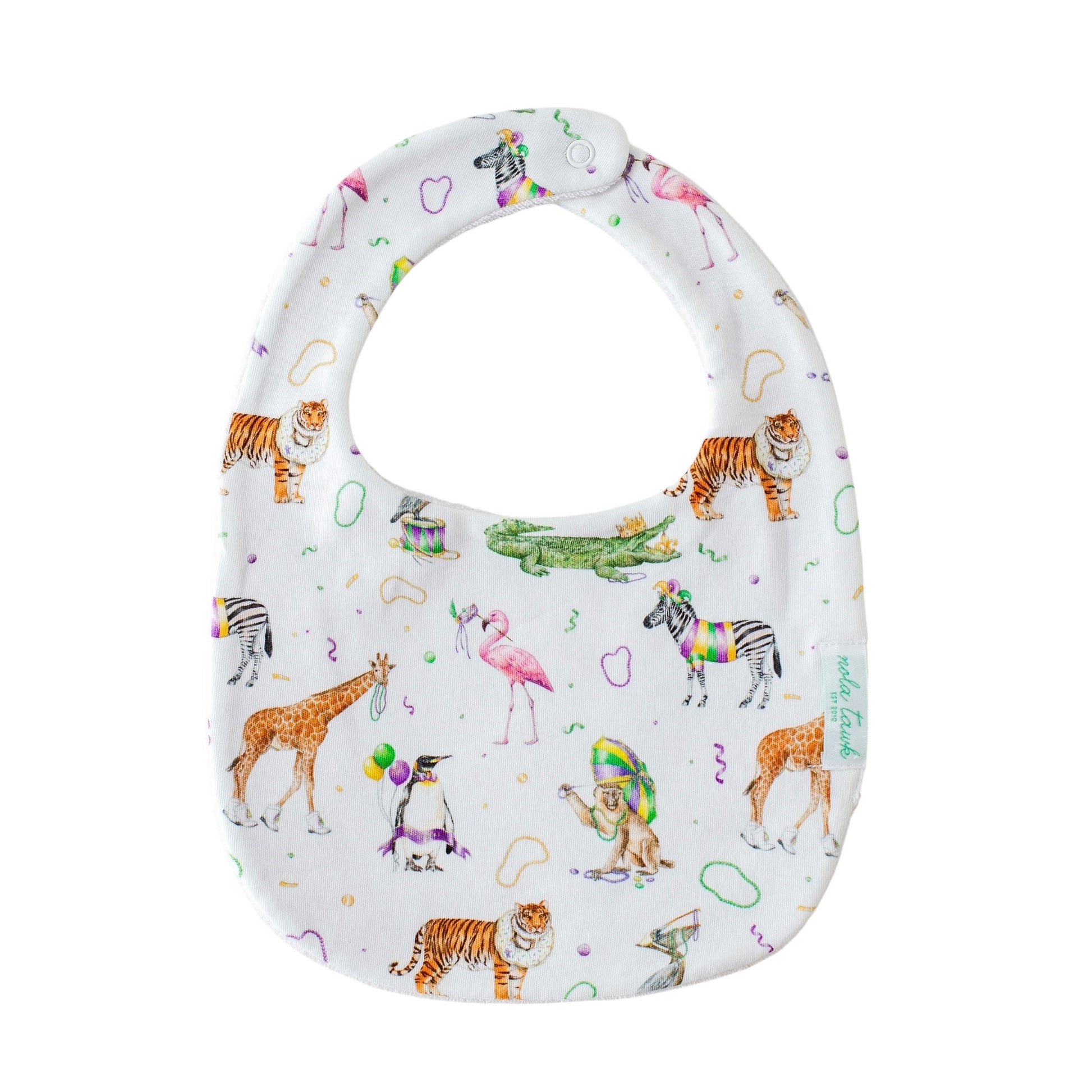 Featuring a playful parade of animals—tigers, giraffes, zebras, flamingos, and more—decked out in festive Mardi Gras flair, this bib is the perfect mix of fun and functional. With colorful beads, masks, and costumes, your little one will be ready to join the krewe in style while staying clean and comfy.