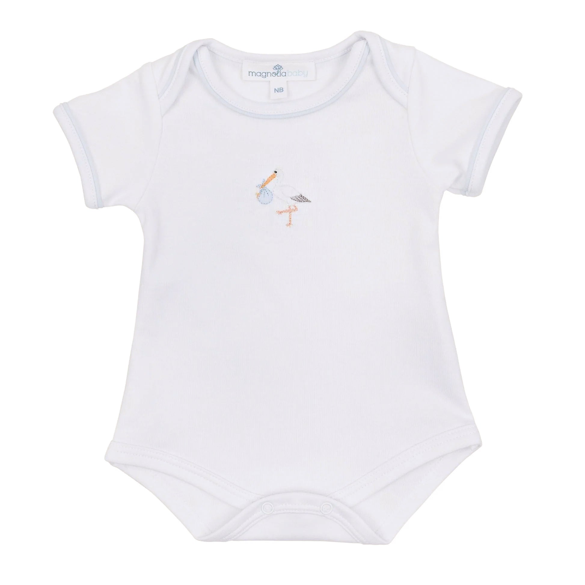 Welcome your little one with the pure, classic charm of the Vintage Stork Bodysuit - Blue. Crafted from luxurious Pima Cotton, this sweet bodysuit features a beautifully hand-embroidered stork carrying a baby in a timeless design.