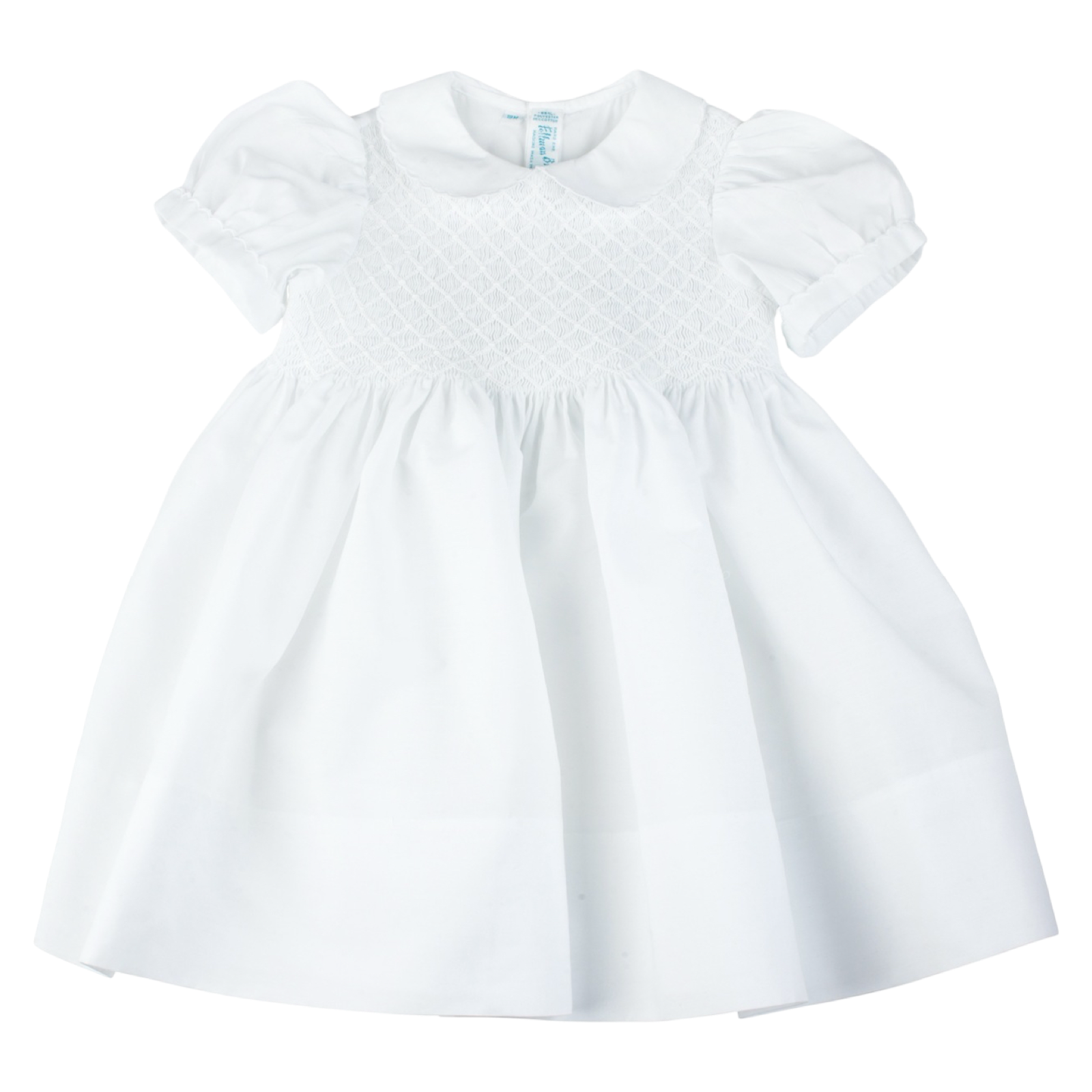 This crisp white girls dress is a true Feltman Brothers classic! The top of this beauty features smocking covered in lovely diamond embroidery until the waist, and scallop edges along the collar and cuffs. Ties in the back with a big bow for that perfect finishing look. The Feltman Brothers Diamond Smocked Dress - for Easter, Sunday wear, and your little one's special occasion!
