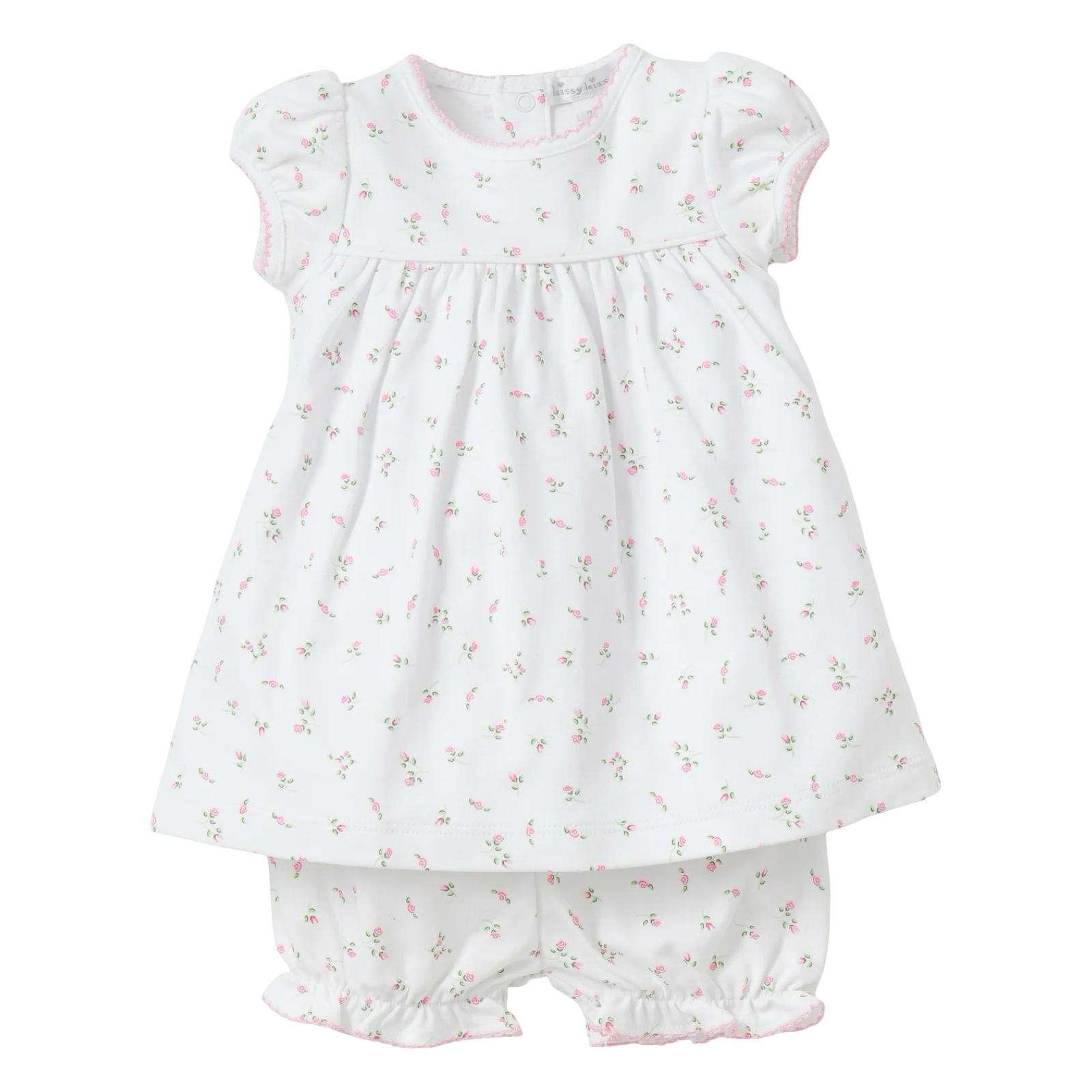 - Tiny and sweet rosebuds pattern this baby girl's dress set, complete with a diaper cover. Made from 100% Pima cotton for a soft and comfortable fit.