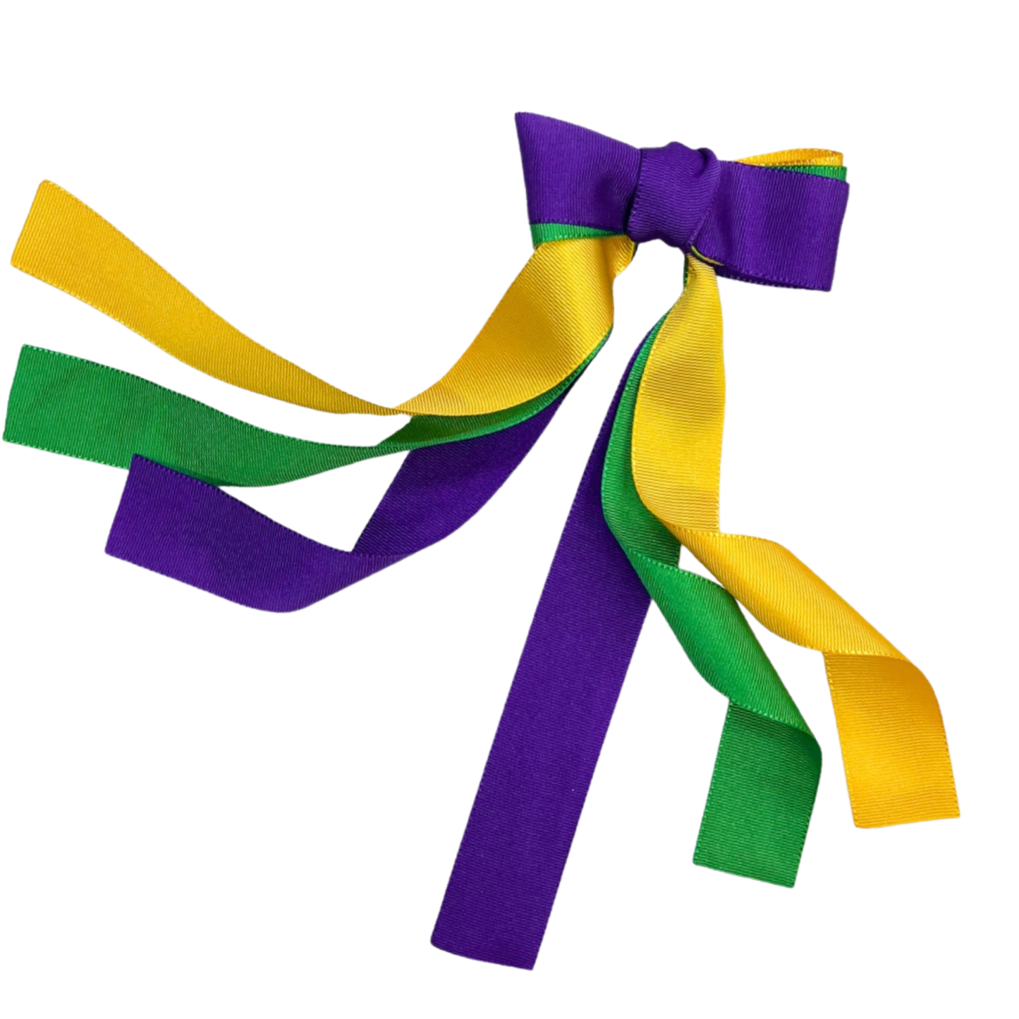 The time for a wider long tail bow has come. A double or triple colored bow perfect for your little tiger or Mardi Gras Bebe!