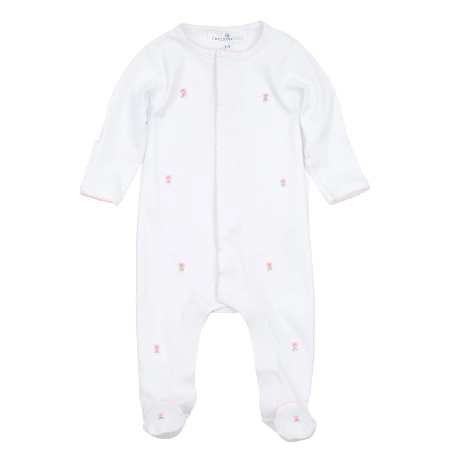 Add a touch of elegance to your baby's wardrobe with the Juliette’s Classics Scattered Footie. This footie features hand-embroidered floral details scattered across the fabric, all on the softest 100% Pima cotton. Designed for both comfort and style, it's perfect for daily wear or special occasions. A lovely choice for a baby shower gift or a take-me-home outfit.