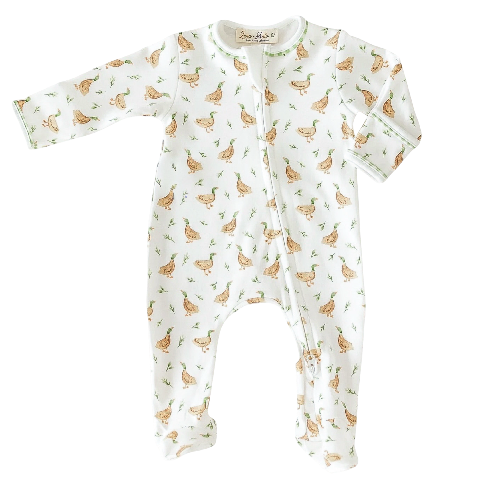 Crafted from luxurious Pima Cotton, this sweet zip footie features a playful all-over print of charming mallard ducks. The two-way zipper ensures a smooth and quick dressing and changing process.