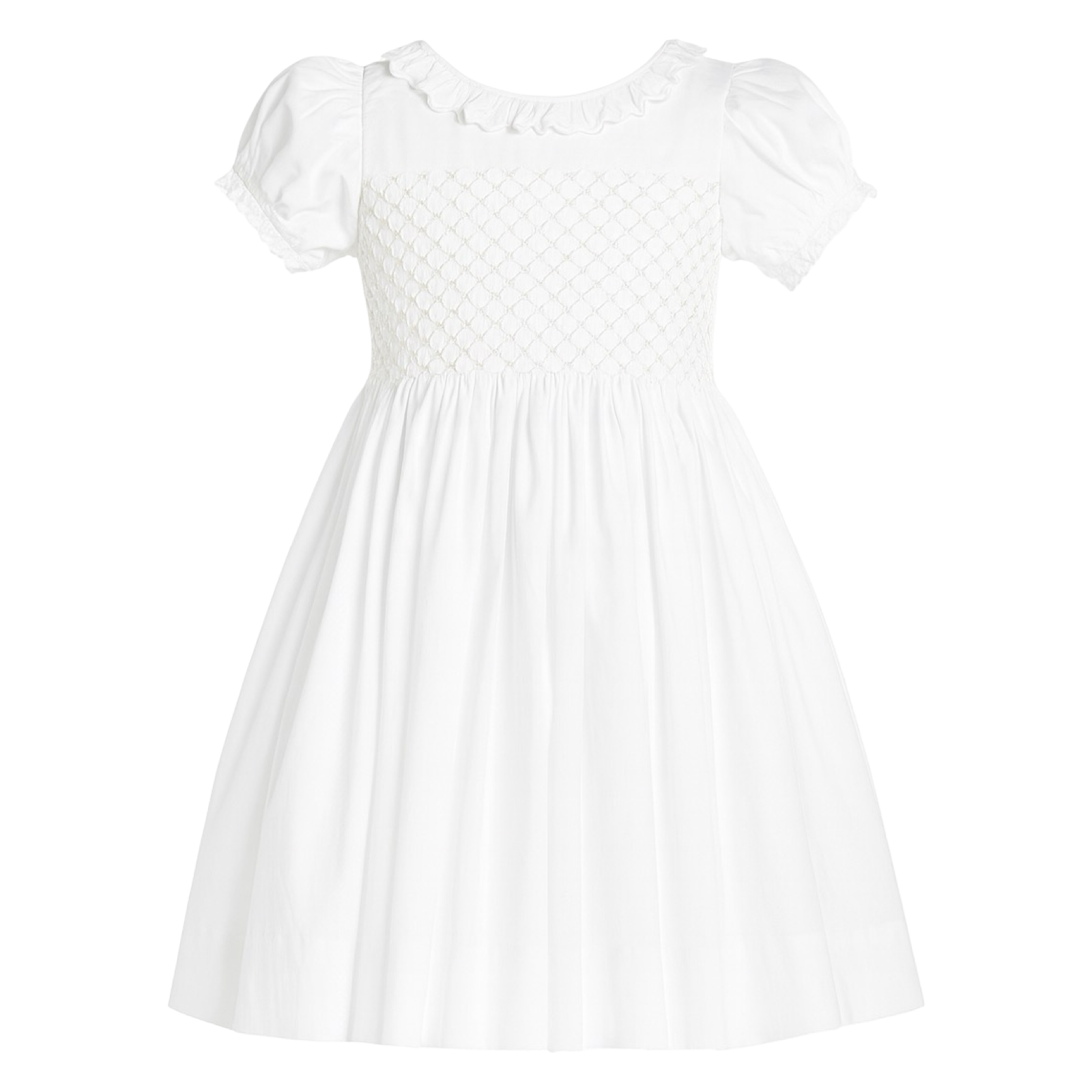 Antoinette Paris OUR BEST HEIRLOOM! A MUST-HAVE! Sophisticated White Hand smocking embroidery from waist up on a short balloon assembled sleeves. Waiving frills collar ending with a delicate and refined white lace! Perfect for special events : First Communion, Christening or Flower girls! 100% POPLIN COTTON