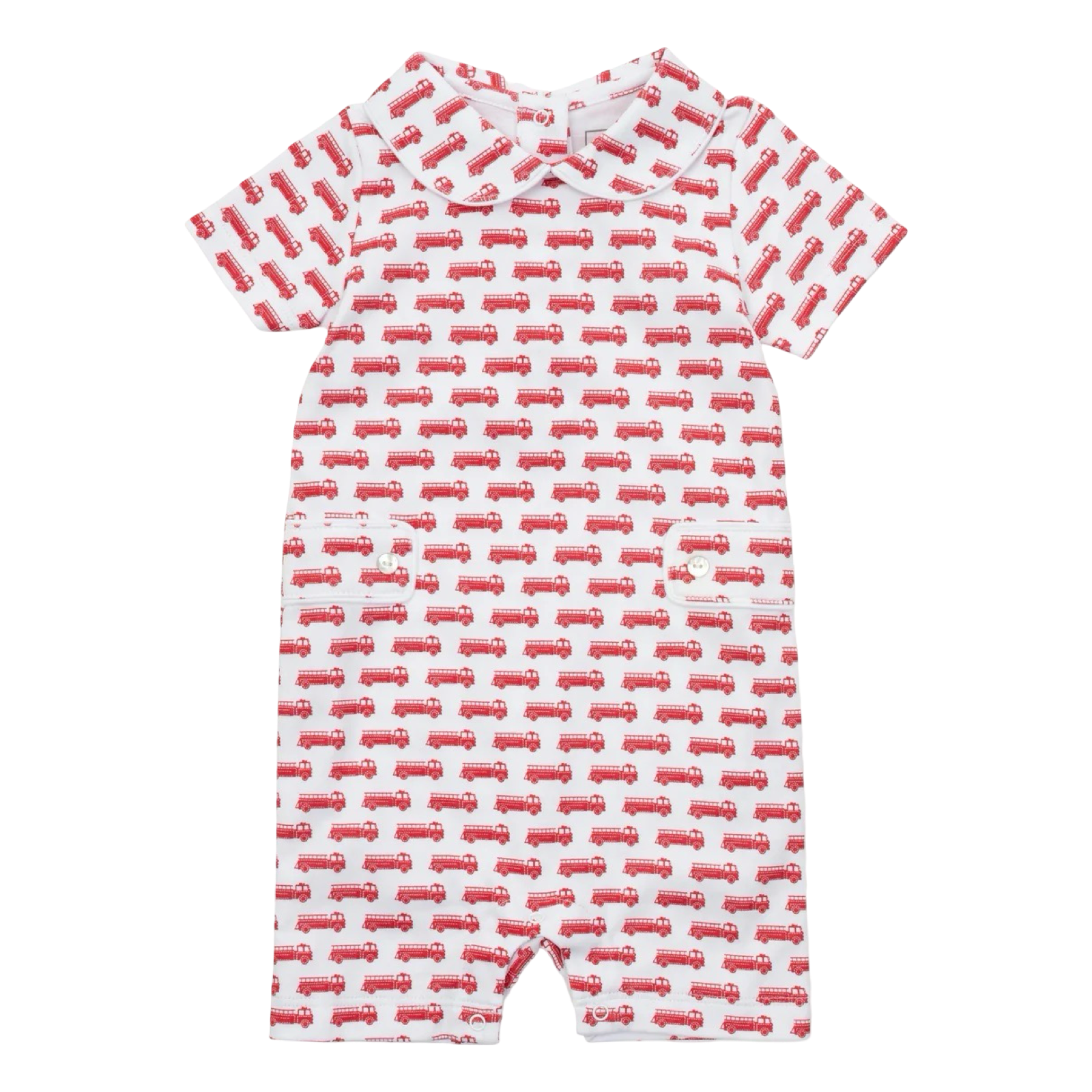 Boys' pima cotton shortall with contrast stitching on collar and side plackets. Snaps in stride and back of neck.