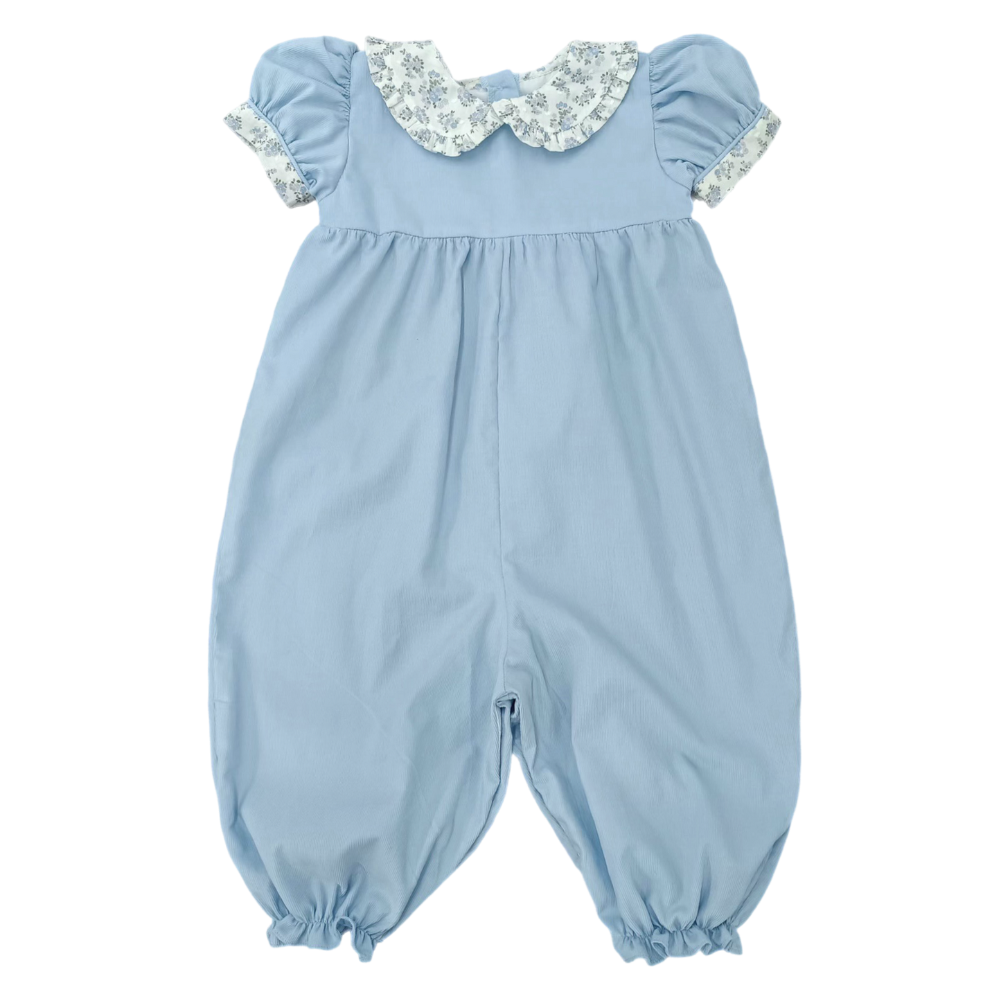 Blue cord short sleeve long bubble with dotted Swiss floral collar and trim