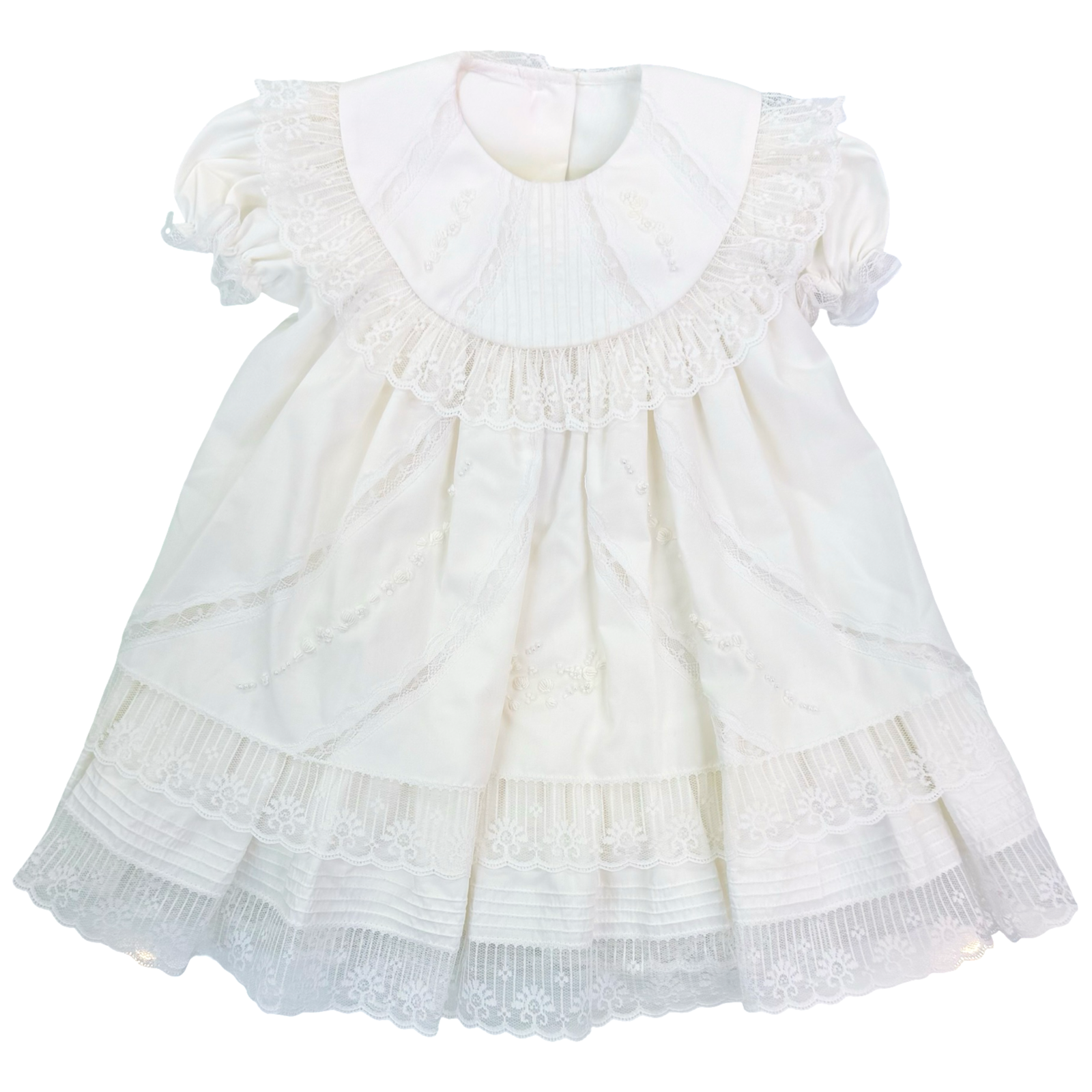 Classic style beautiful ivory layer heirloom dress with embroidered flowers, tiny seed pearls and delicate lace border details. Fully lined. Poly Cotton.
