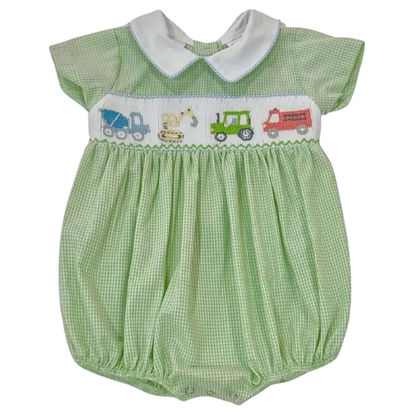 Lulu Bebe mint green gingham short sleeve collared bubble featuring vehicles smocking