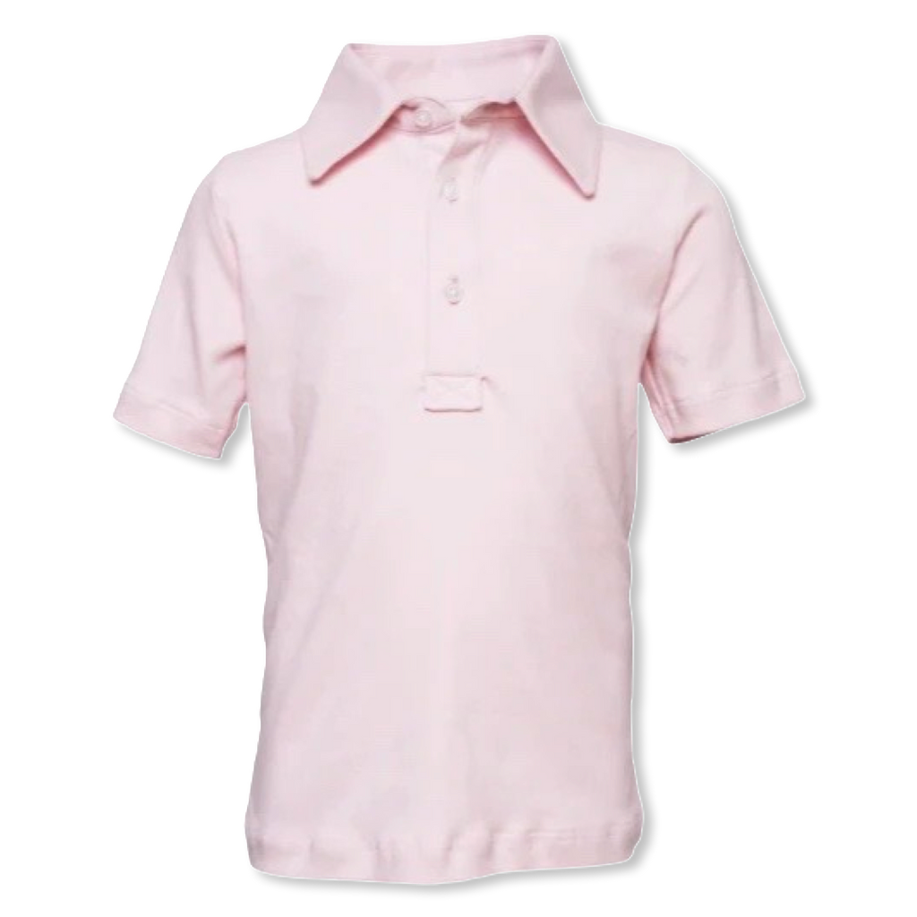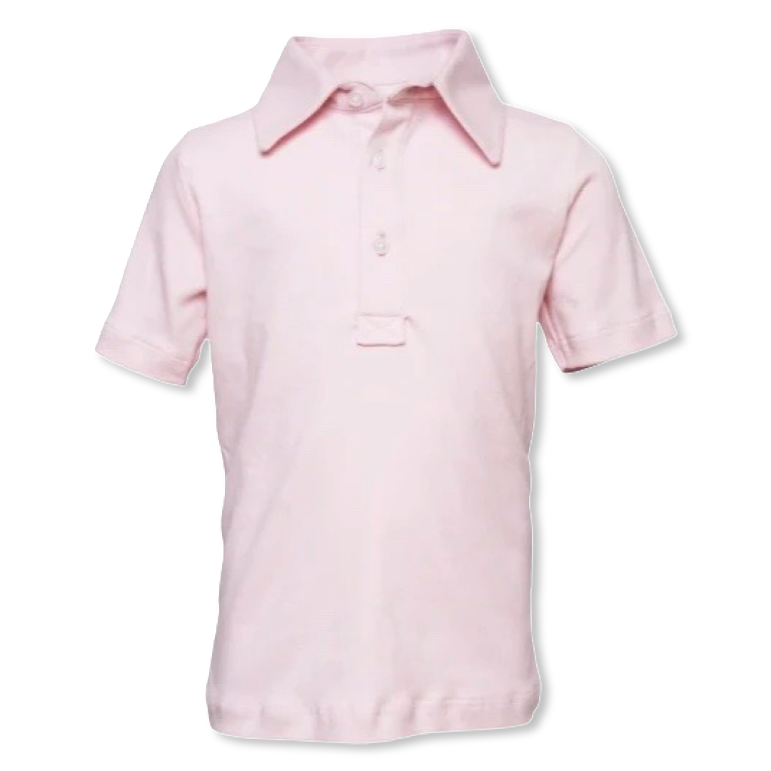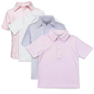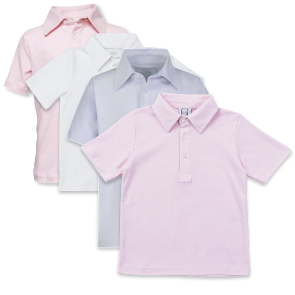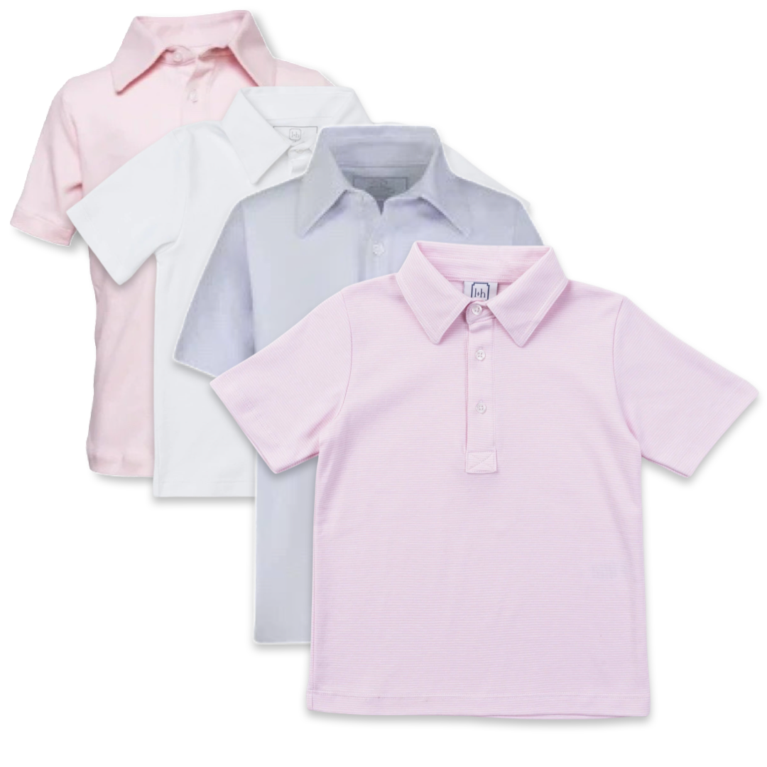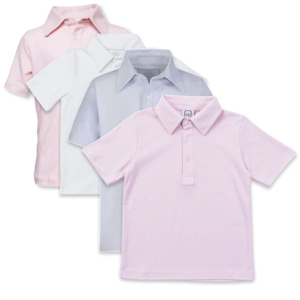 Boys' pima cotton golf shirt. Available in white, blue, light pink, and pink stripe