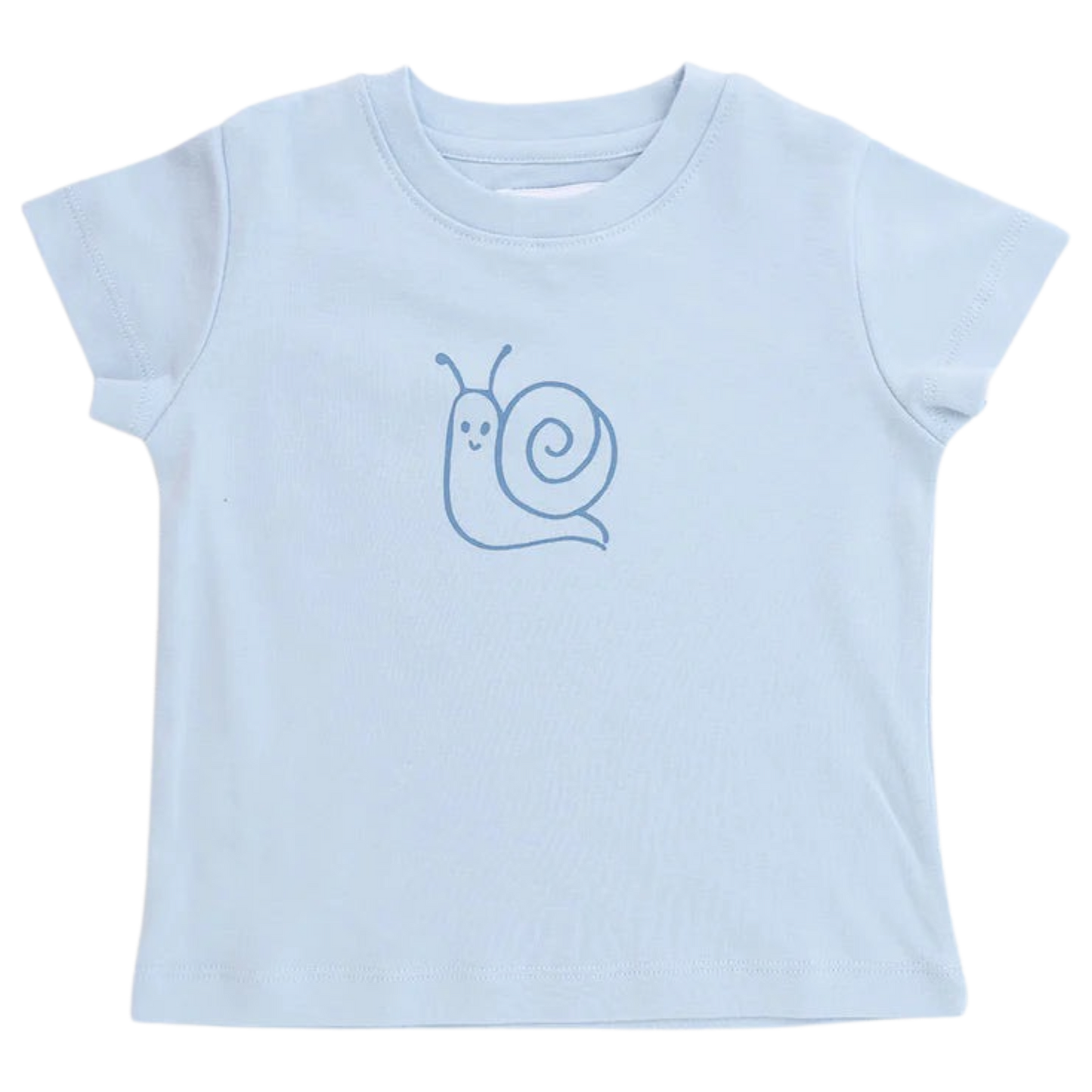 Our signature short sleeve cotton light blue tee features a navy blue snail. Pair with the lake blue James Shorts or the new Light Blue Stripe Knit Shorts.
