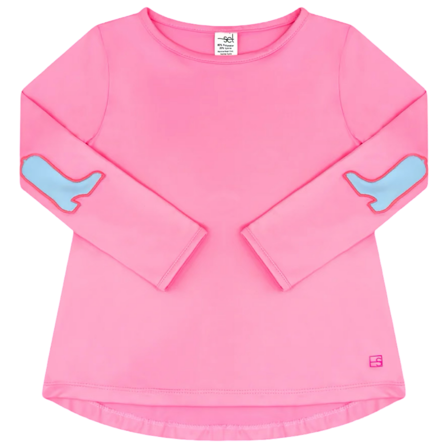 A basic but better, our Kylie Long Sleeve Tee is always accompanied by a fun elbow patch. This tee in Flamingo Pink with Cotton Candy Blue boot elbow patches goes perfectly with everything in our Two Step collection.
