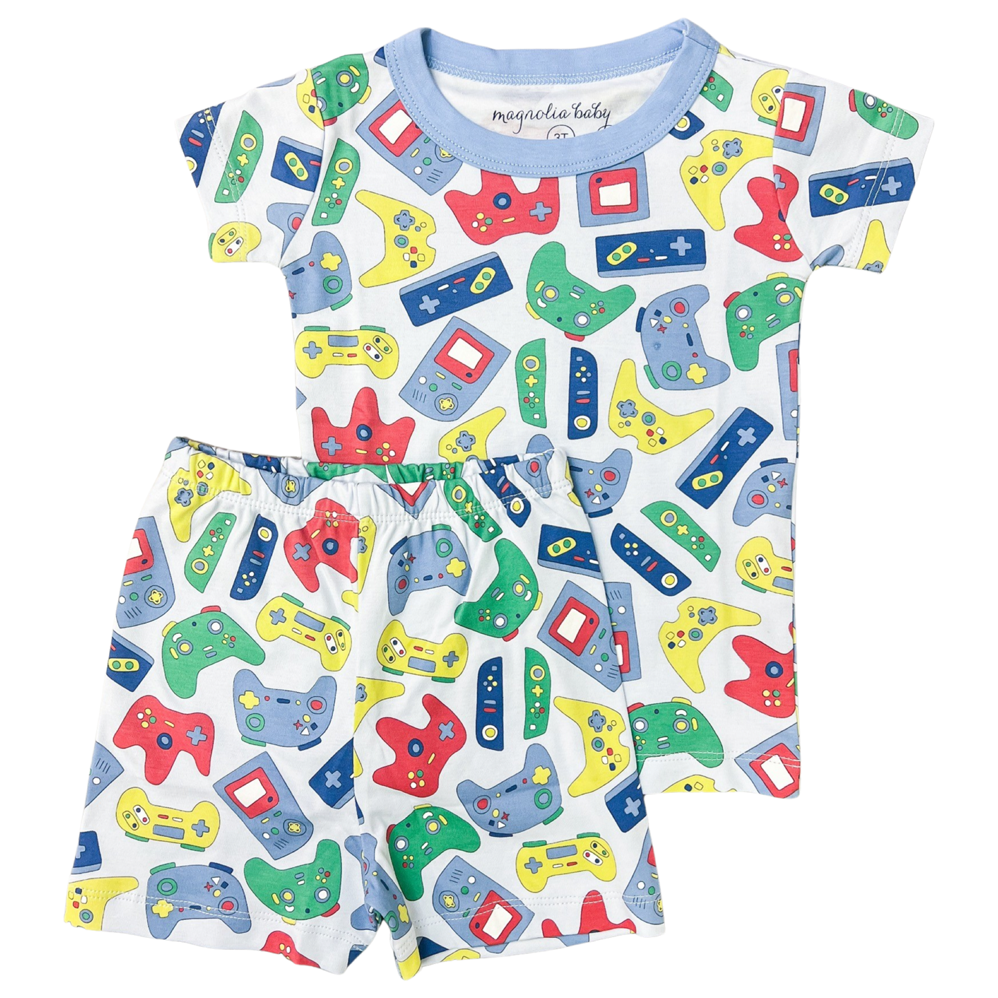 Magnolia Baby short sleeve/short pajama set featuring gamer print with blue trim