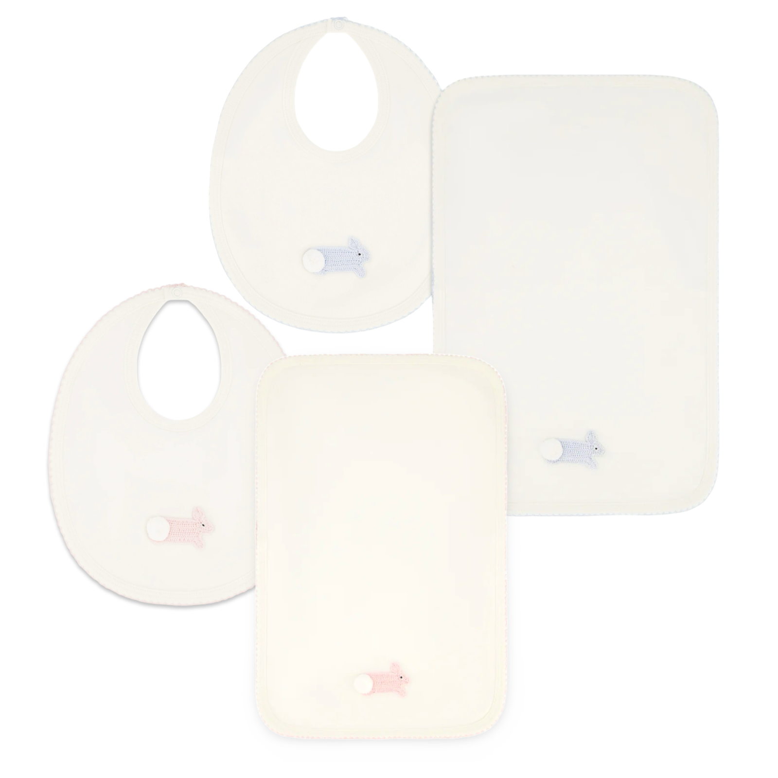 Our bib features a convenient snap closure and comes with a coordinating burp cloth backed in super-soft terry. 100% cotton; machine wash. One size. *bella bliss® uses the finest cottons available. For best results, lay flat to dry then fluff on low heat.