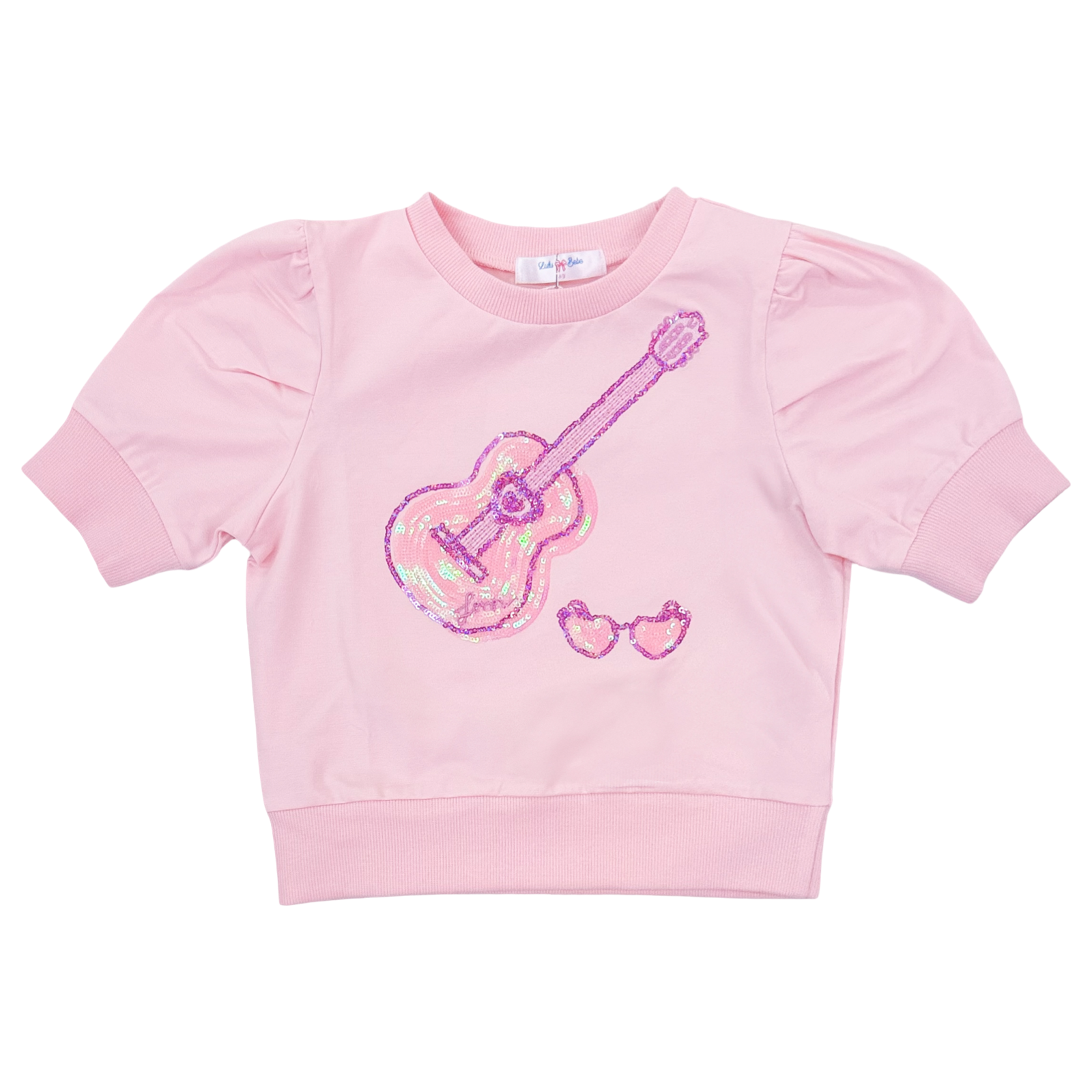 Lulu Bebe short sleeve pink knit puff sleep top featuring sequined guitar