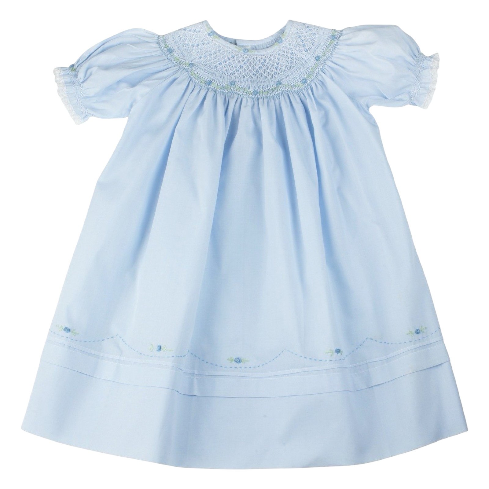 Looking for just the right dress for your little girl that is classy, cute, and vintage looking? Meet our Rosette Bishop Dress, a beautiful, intricate smocked bishop dress, available in classy blue and pink colors. Intricate floral embroidery graces the yoke, puff sleeves and hem, along with dainty lace trim and soft gathered pleats all down the front. With so many beautiful, eye catching details, this dress is sure to be a winner time and again!