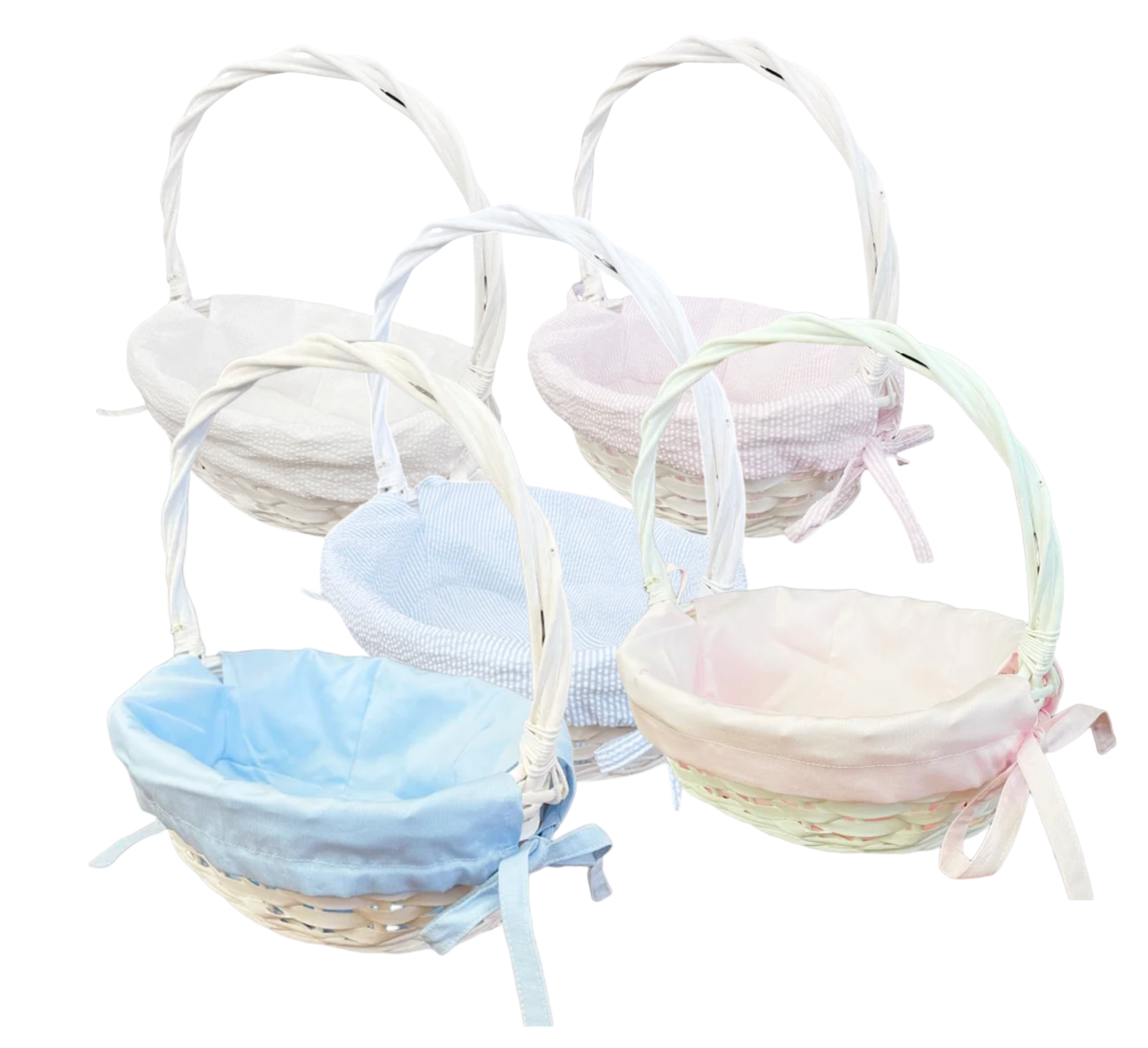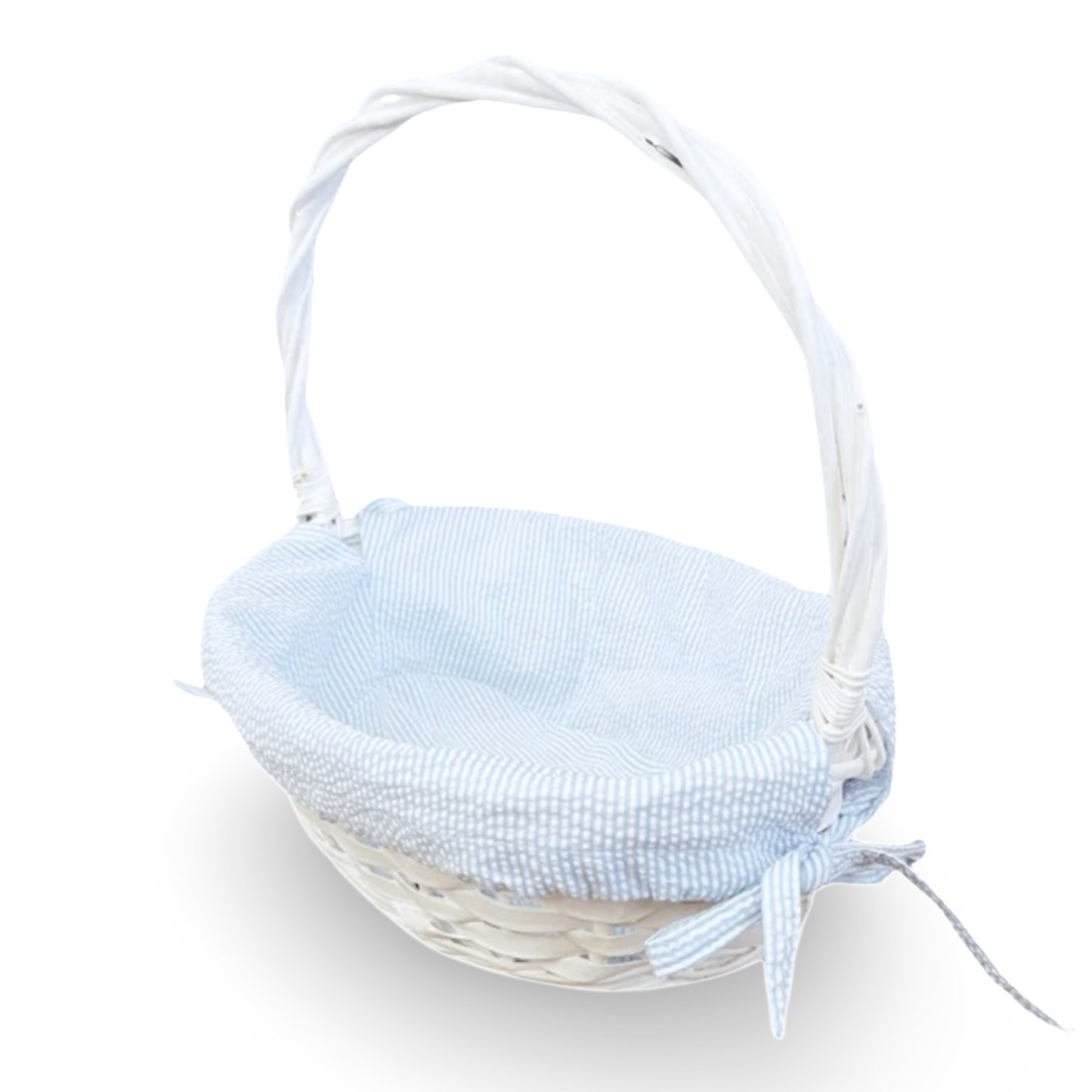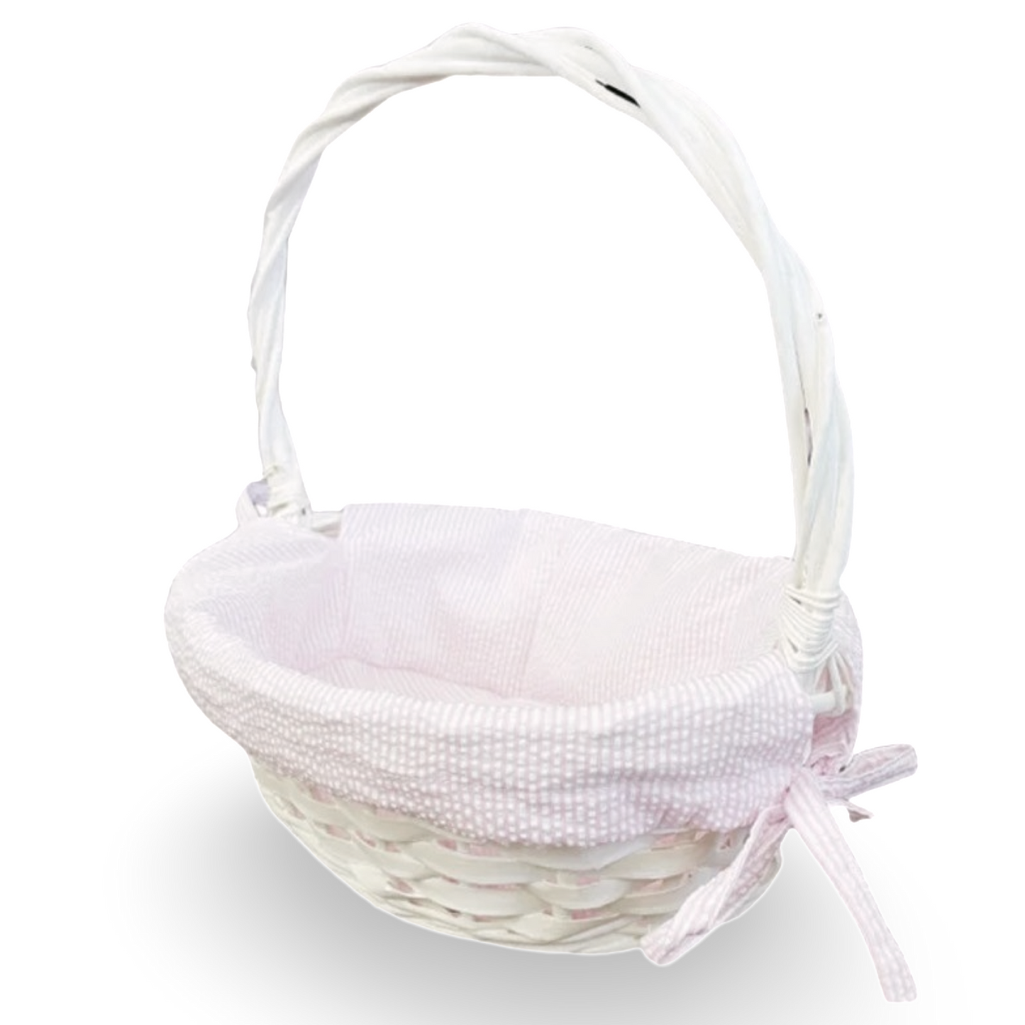 The Bow Next Door large white wicker basket with handmade seersucker liner available in white, pink, and blue.