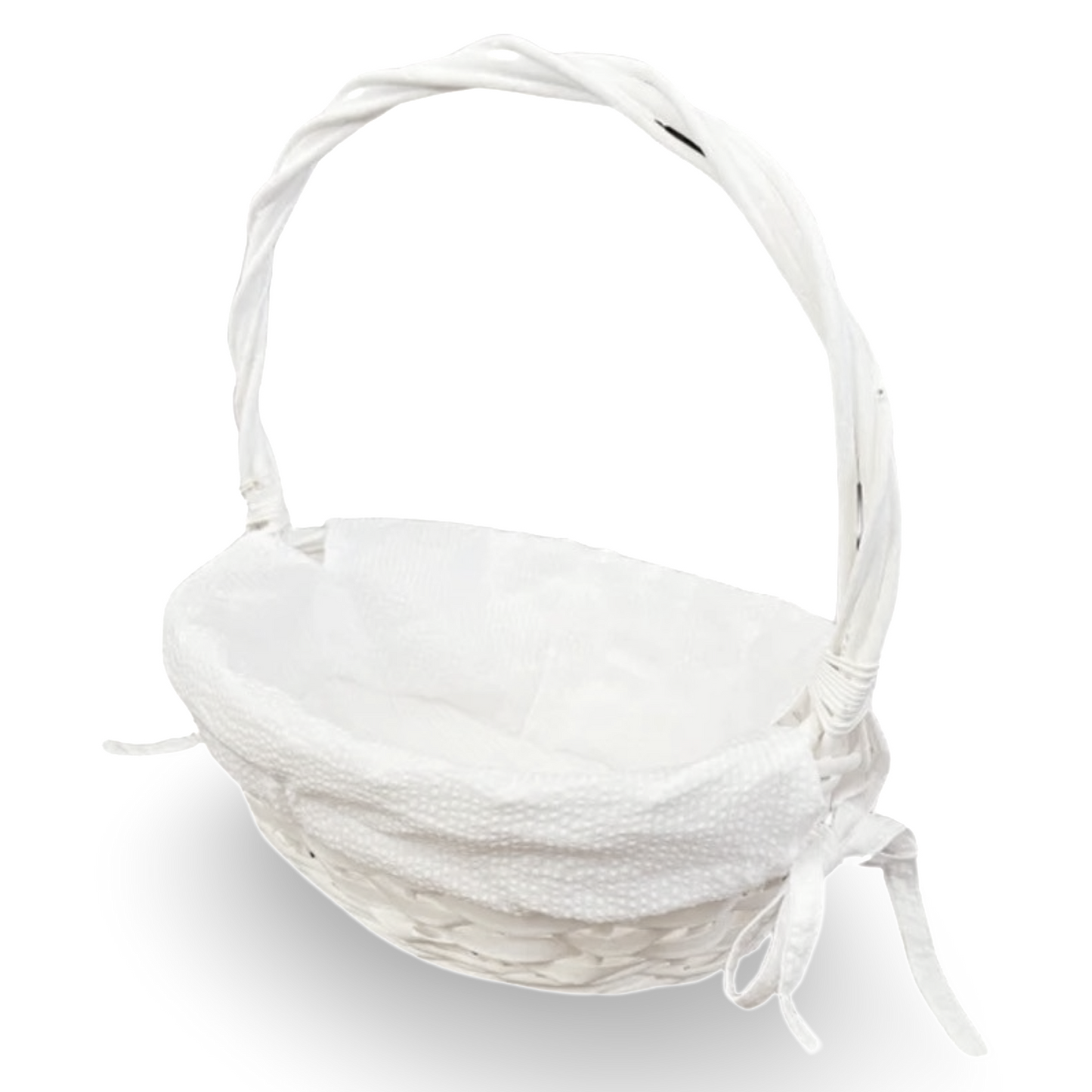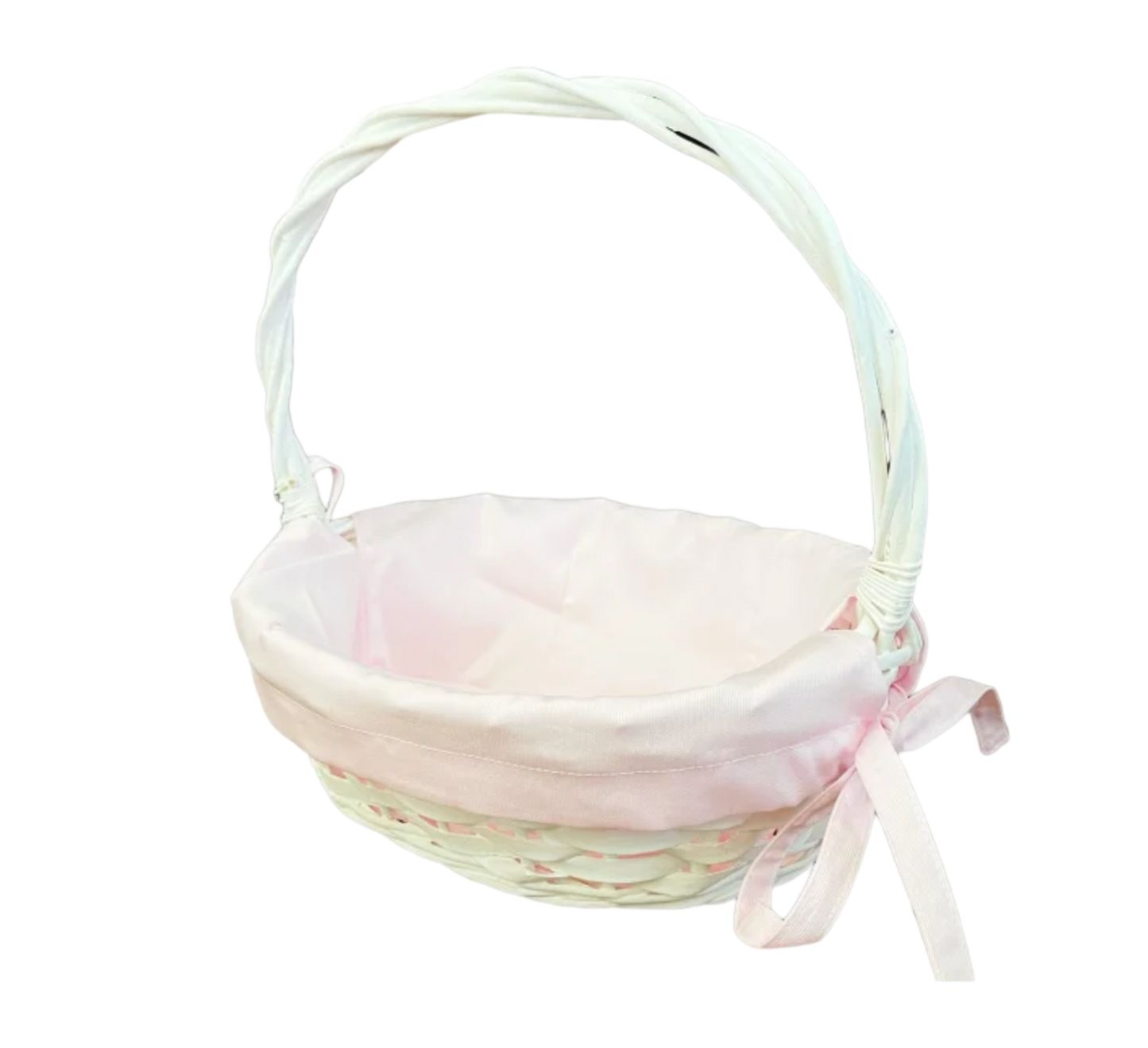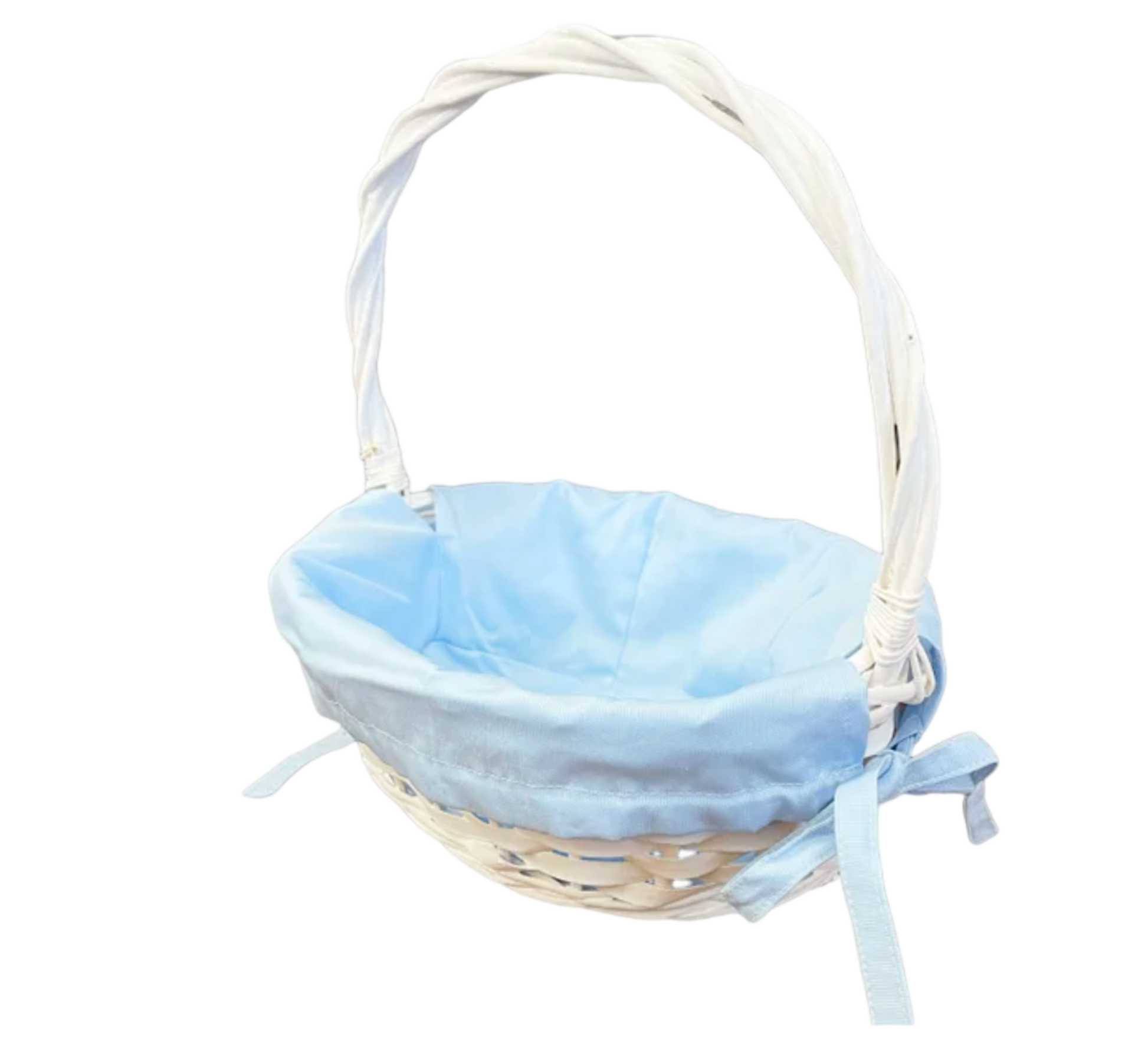 The Bow Next Door large white wicker basket with handmade seersucker liner available in white, pink, and blue.